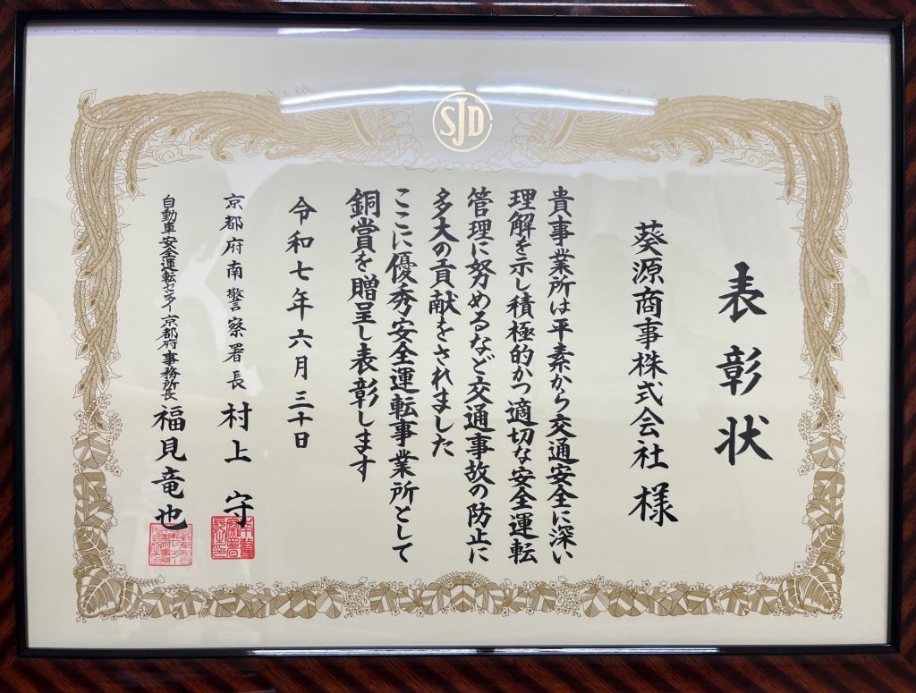 京都府警および自動車安全運転センターより、当社が「優秀安全運転事業所」として【銅賞】を頂きました。